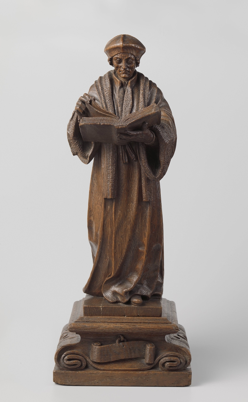 | A copy of the bronze statue by Hendrick de Keyser in Rotterdam. Rooted in a naturalistic approach, he is depicted in scholarly attire while holding an open book, blending reverence for the subject with a classical aesthetic. The figure is positioned on a square pedestal, with intricate details in the folds of the robe and facial expression. The base of the statue includes ornamental features, including scroll motifs. |