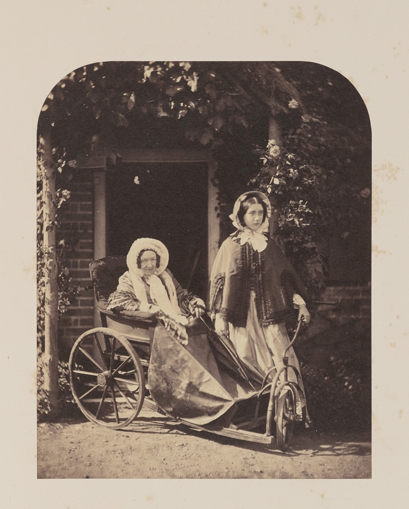 | The relationship between an elderly woman and a younger companion in rural England emphasises the bond of care and responsibility. The elderly woman sits in a wheelchair, while the younger woman stands beside her, one hand on a lever that controls the wheelchair’s steering. This moment reflects the practical aspects of care during an era with limited medical advancements, where personal responsibility played a crucial role in supporting loved ones. |