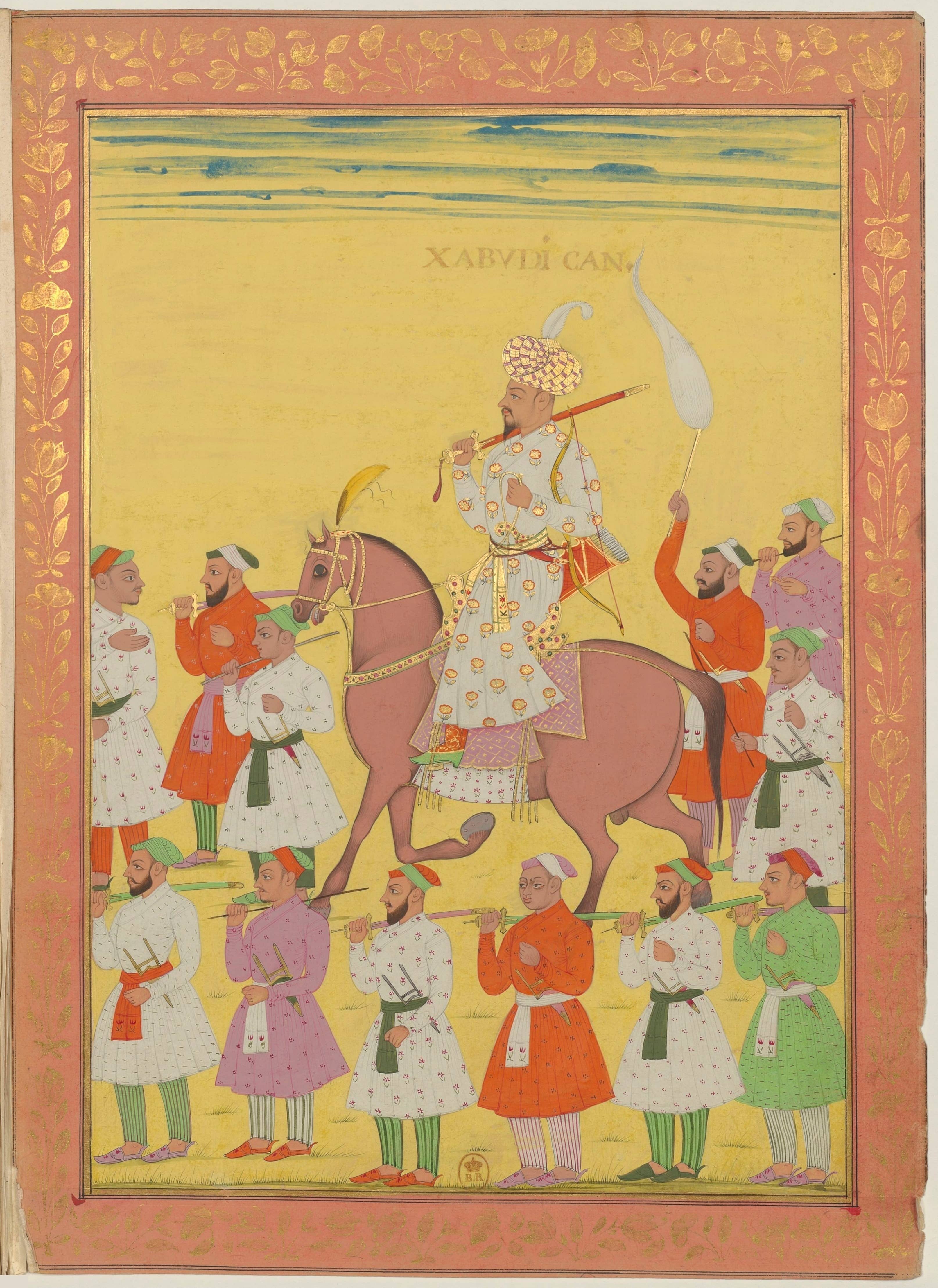 | Inspired by accounts from Manucci's extensive chronicle of the Mughal Empire, Ghazi-ud-din Khan is depicted on horseback, dressed in ornate attire that conveys power and regal presence. He is surrounded by a procession of attendants, richly dressed in vibrant garments of white, red, and orange, with green sashes. Some carry ceremonial items or raise their arms in salute or celebration, and one holds a white ceremonial parasol (chhatra) over his head, signifying his high status within the Mughal court. The background is rendered in bright yellow with minimal scenery, which draws attention to the figures and enhances the sense of splendour and courtly ritual. The work reflects the stylistic traditions of late Mughal miniature painting—characterised by intricate textile patterns, stylised postures, and vivid colours. |