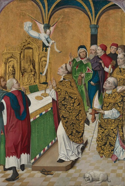 The Mass of Saint Hubert Oil on oak, from the Werden Altarpiece, 123.8 x 83.2 cm by the workshop of the Master of the Life of the Virgin, 1485-90? The National Gallery