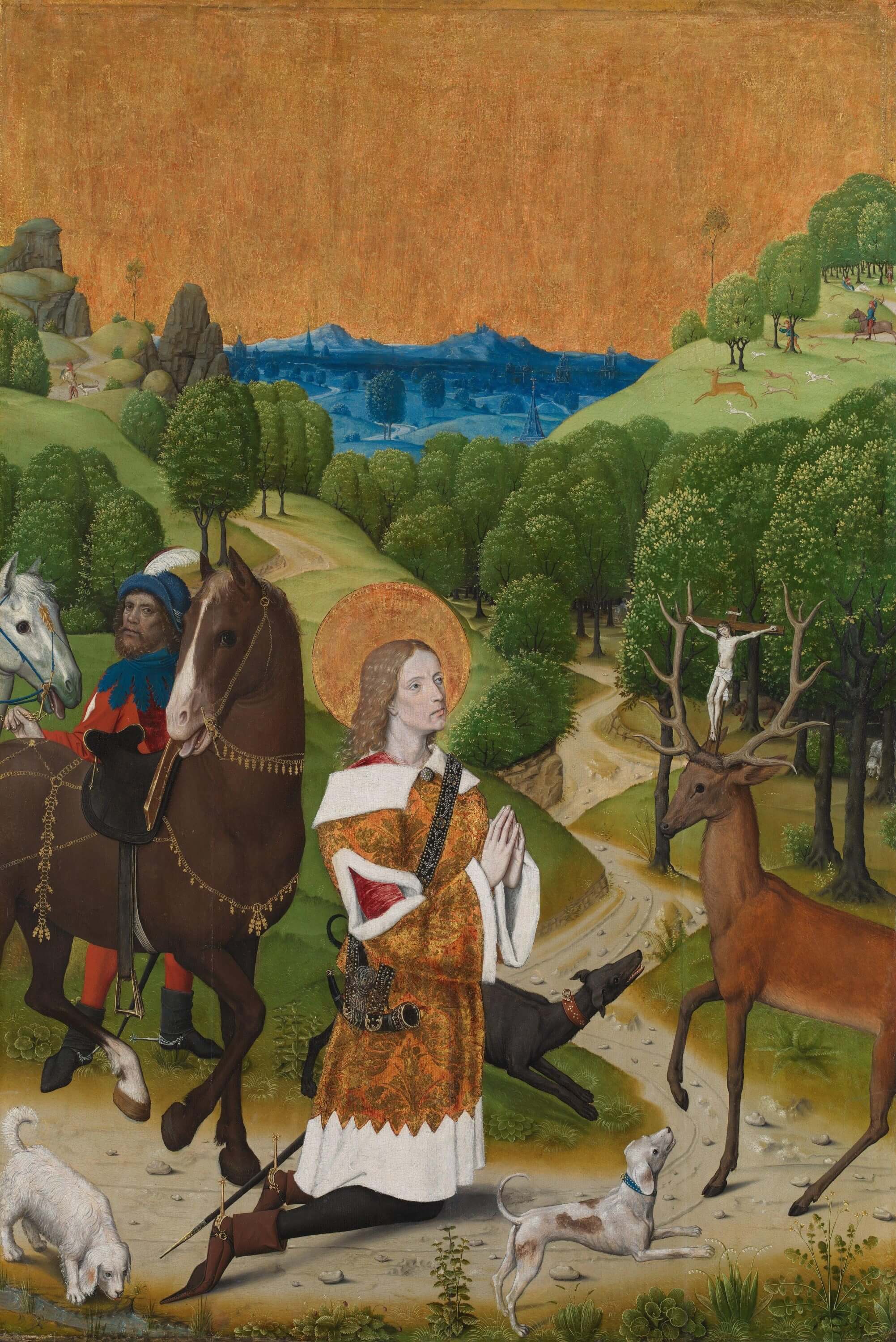 The Conversion of Saint Hubert Oil on oak, 23 x83.2 cm, from the Werden Altarpiece by the workshop of the Master of the Life of the Virgin, 1485-90? The National Gallery, London